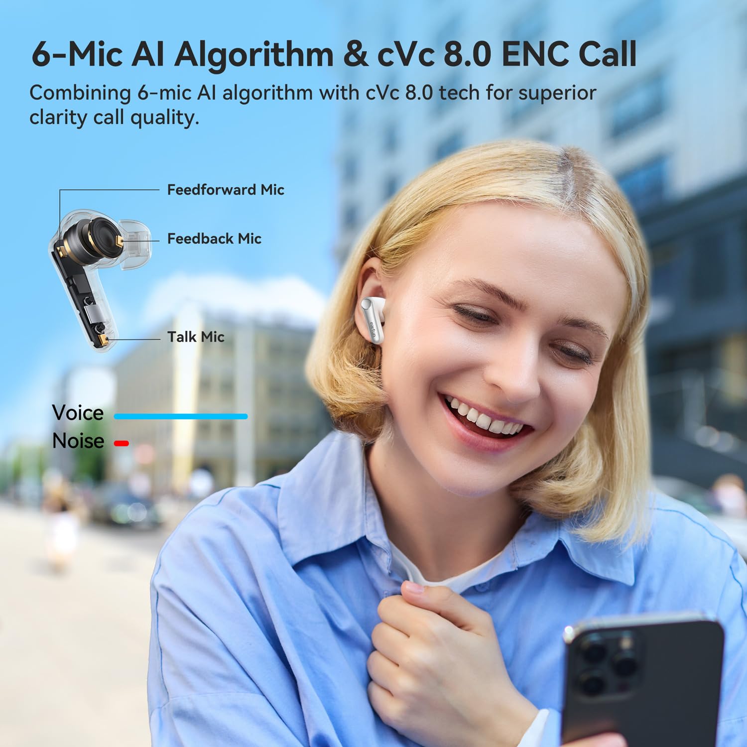 - 🎧 Support for LDAC, LE Audio, and LC3 codecs ensures compatibility with high-fidelity sources. AI Algorithm and 6 Mics ENC. Enhanced by 6 built-in microphones, advanced AI algorithms, and Qualcomm cVc 8.0 tech, the wireless earbuds with active noise cancellation effectively eliminate background noise to improve vocal clarity during calls. Enjoy crystal -clear calls regardless of your surroundings.