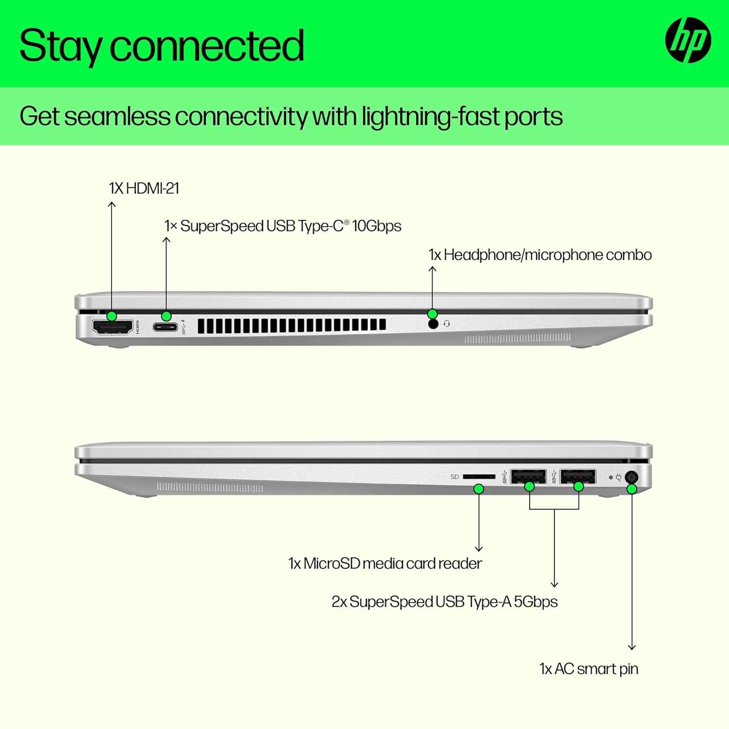 Other Features: HP True Vision 5MP camera with camera shutter,|Networking: Realtek Wi-Fi 6 (2×2) and Bluetooth 5.3 wireless card (supporting gigabit data rate)|Keyboard & Pointing Device:Full-size, backlit, natural silver keyboard |Battery: 3-cell, 43 Wh Li-ion polymer