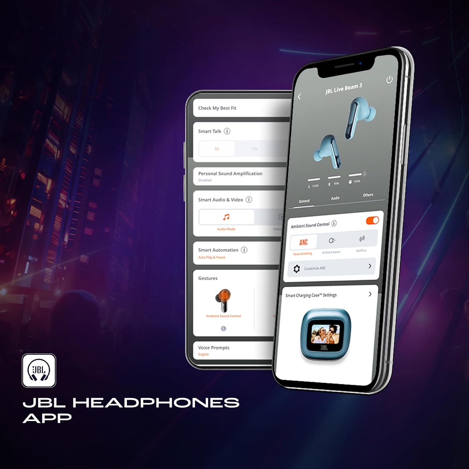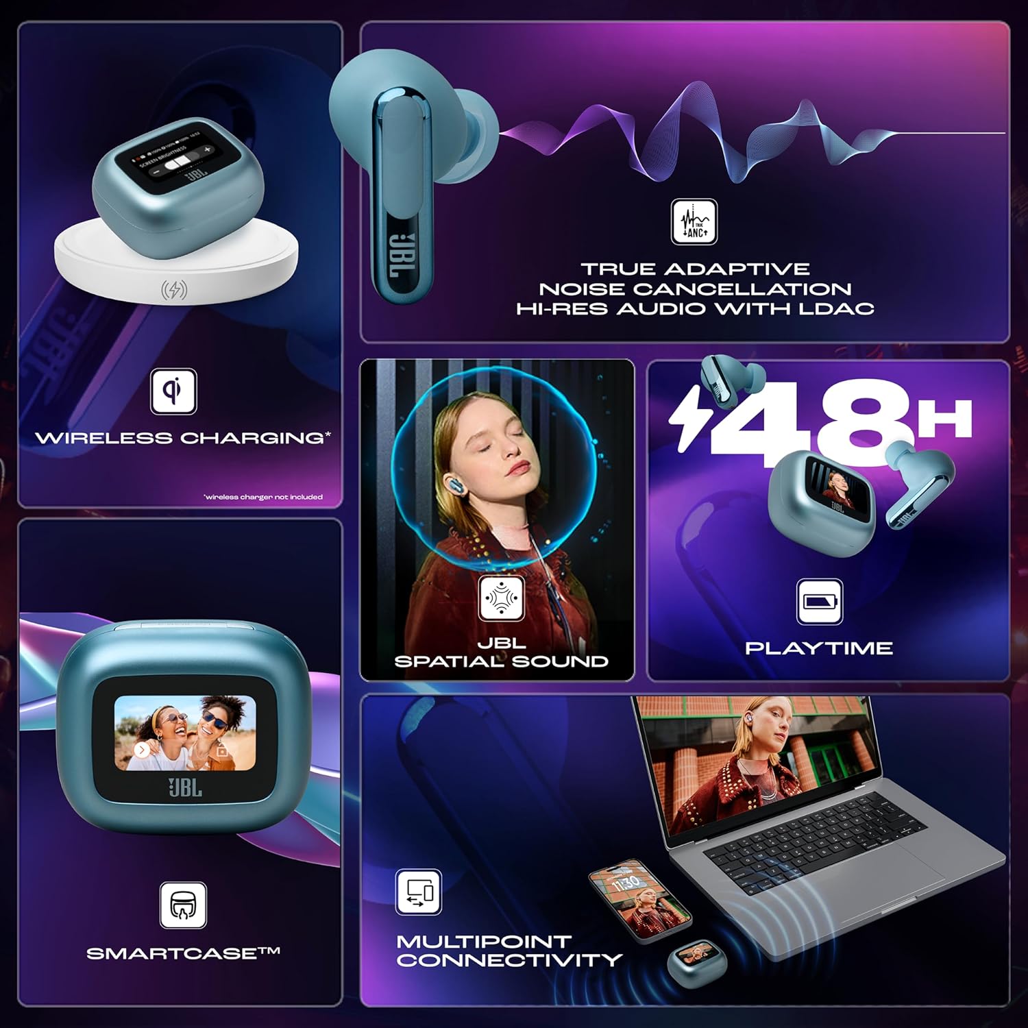 • JBL Live Beam 3 TWS earbuds with Hi-Res audio, True ANC, 48H playtime, smart case with touch display, 6 mics, multipoint connection & wireless charging. Blue.
