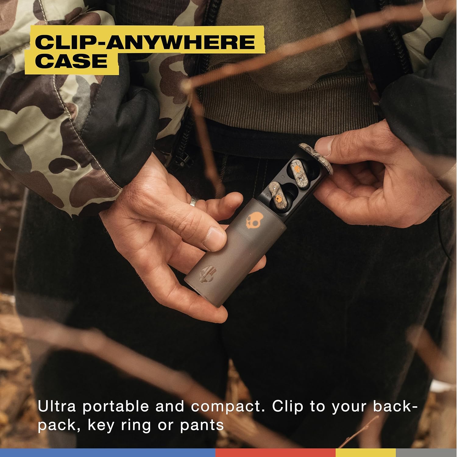 Skullcandy Dime Evo Wireless Earbuds, Bluetooth Headphones, Noise Isolating Fit, Up to 36 Hours Battery, Microphone, Easy Carry with Clip-Anywhere Case – Realtree APX Black/Orange