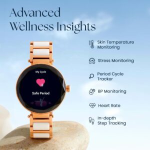 - Designed for Modern Women – Track women’s health, skin temperature, heart rate, SpO2, BP, stress, sleep with REM, hydration alerts & breathing rate—smartwatch for women that supports all-day wellness and well-being.